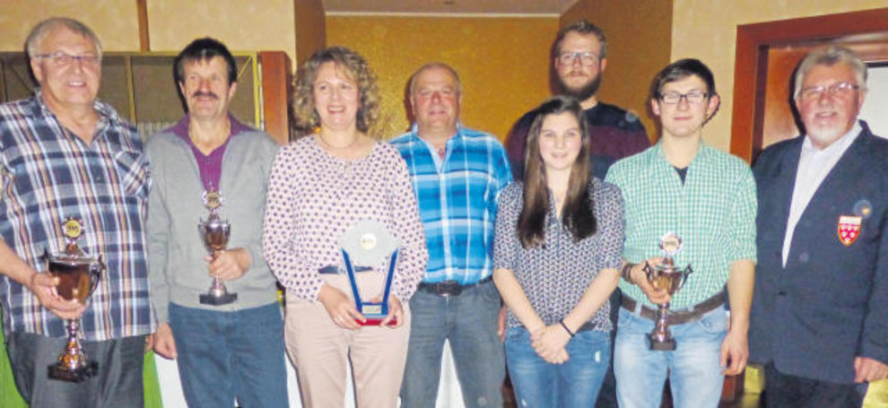 | Die Sieger bei den Erwachsenen (von links): Albert Greß, Walter Franz, Liane Reger, Reinhold Reger, Anne Renner, Bertram Lukesch, Lukas Renner und ASC-Vorsitzender Hans Bohmann. |